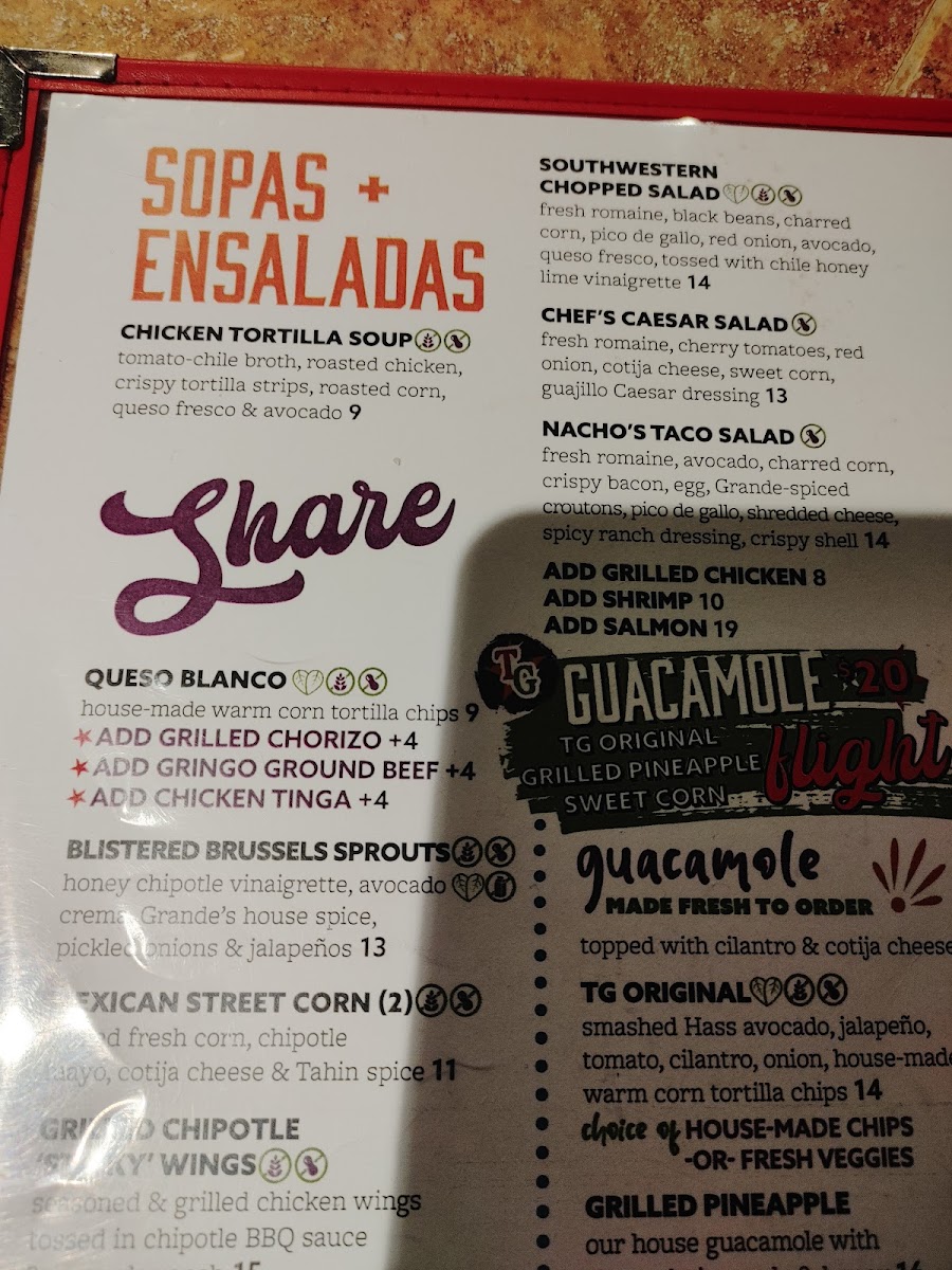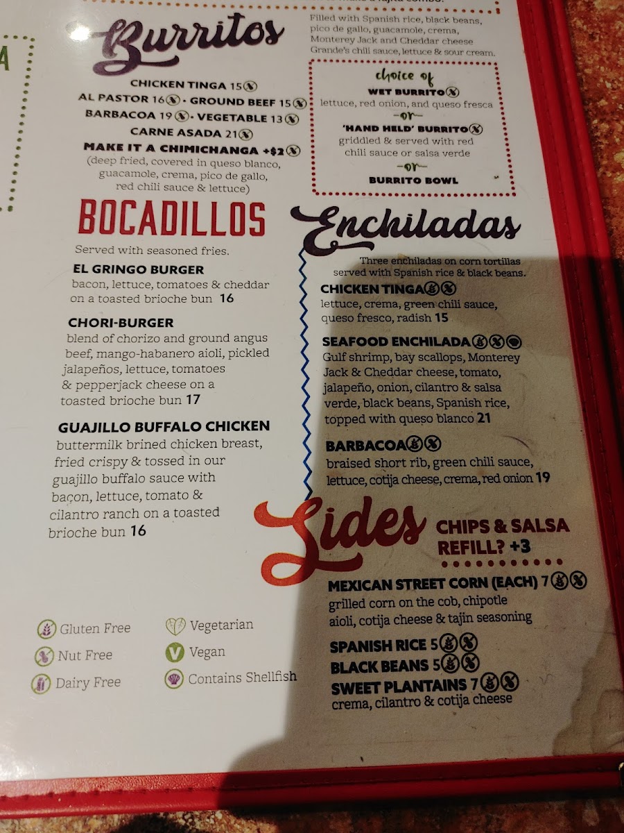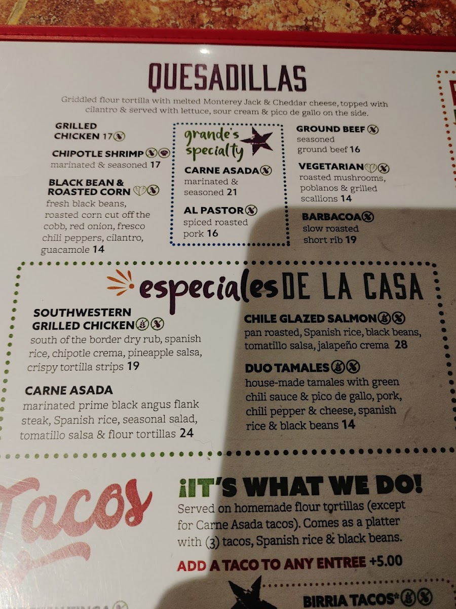 Filled with Spanish rice, black beans, Monterey jack and Cheddar cheese and Grande’s chili sauce, served with pico de gallo & sour cream